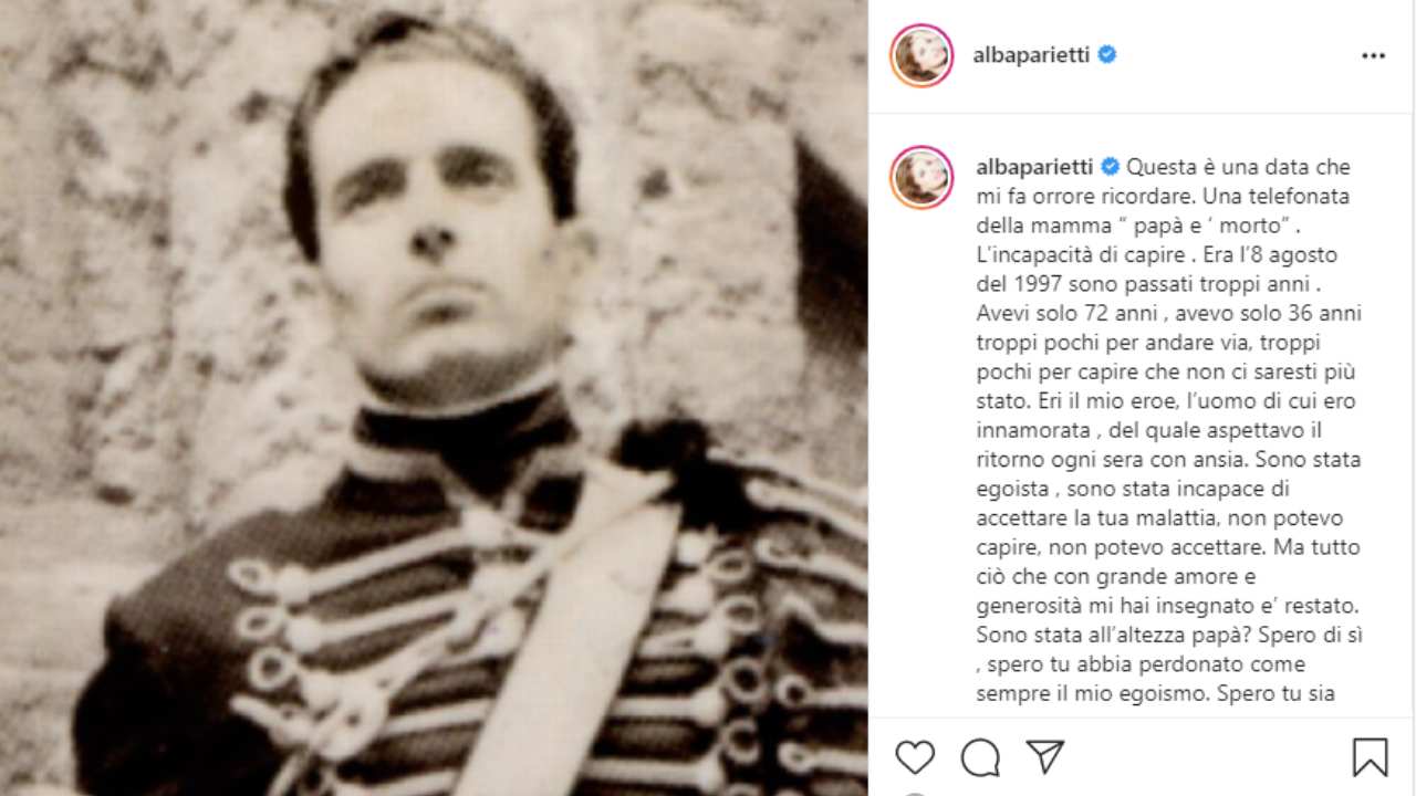L’8 agosto è per la Parietti un giorno difficile, il giorno in cui è morto il padre. Ieri, in occasione del 24° anniversario di quella triste giornata, Alba ha voluto condividere un post dedicato al genitore, in cui palesa l’ancora presente difficoltà ad accettare quel lutto: “Questa è una data che mi fa orrore ricordare. Una telefonata della mamma ‘papà è morto’ . L’incapacità di capire . Era l’8 agosto del 1997 sono passati troppi anni . Avevi solo 72 anni , avevo solo 36 anni troppi pochi per andare via, troppi pochi per capire che non ci saresti più stato. Eri il mio eroe, l’uomo di cui ero innamorata , del quale aspettavo il ritorno ogni sera con ansia”.