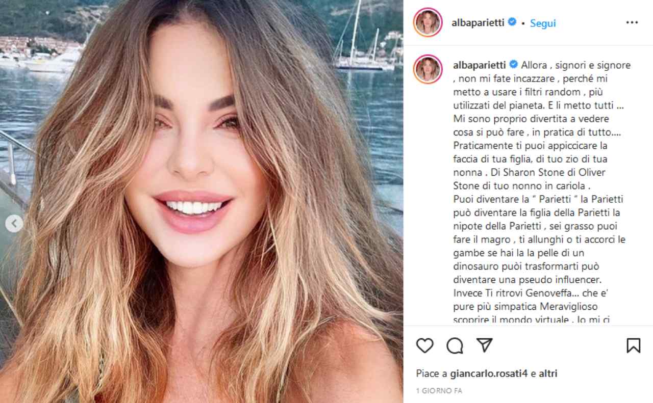 Il post in questione ci mostra due foto di Alba Parietti con i filtri a disposizione di ogni utente e il risultato è effettivamente incredibile. Grazie ai filtri, infatti, la soubrette appare con la pelle e l’aspetto di una ventenne, al punto da risultare quasi irriconoscibile anche per chi sa perfettamente chi è. Come anticipato, lo scopo non è quello di sembrare meglio di ciò che è o più giovane, ma di sperimentare e giocare: “Allora , signori e signore , non mi fate incazzare , perché mi metto a usare i filtri random , più utilizzati del pianeta. E li metto tutti … Mi sono proprio divertita a vedere cosa si può fare , in pratica di tutto”.