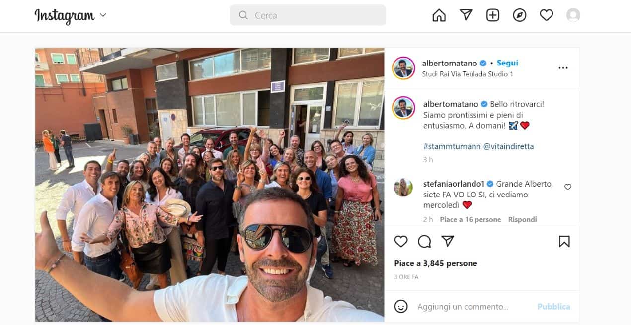 “Bello ritrovarci! – scrive Alberto Matano nel messaggio che accompagna una foto di gruppo, con il giornalista e conduttore in primo piano e sullo sfondo la nutrita troupe de La Vita in Diretta -. Siamo prontissimi e pieni di entusiasmo. A domani! ✈️❤️”. Con un insolito hashtag dialettali che rimanda alle origini meridionali dell’ex mezzobusto del TG1: “#stammturnann“.