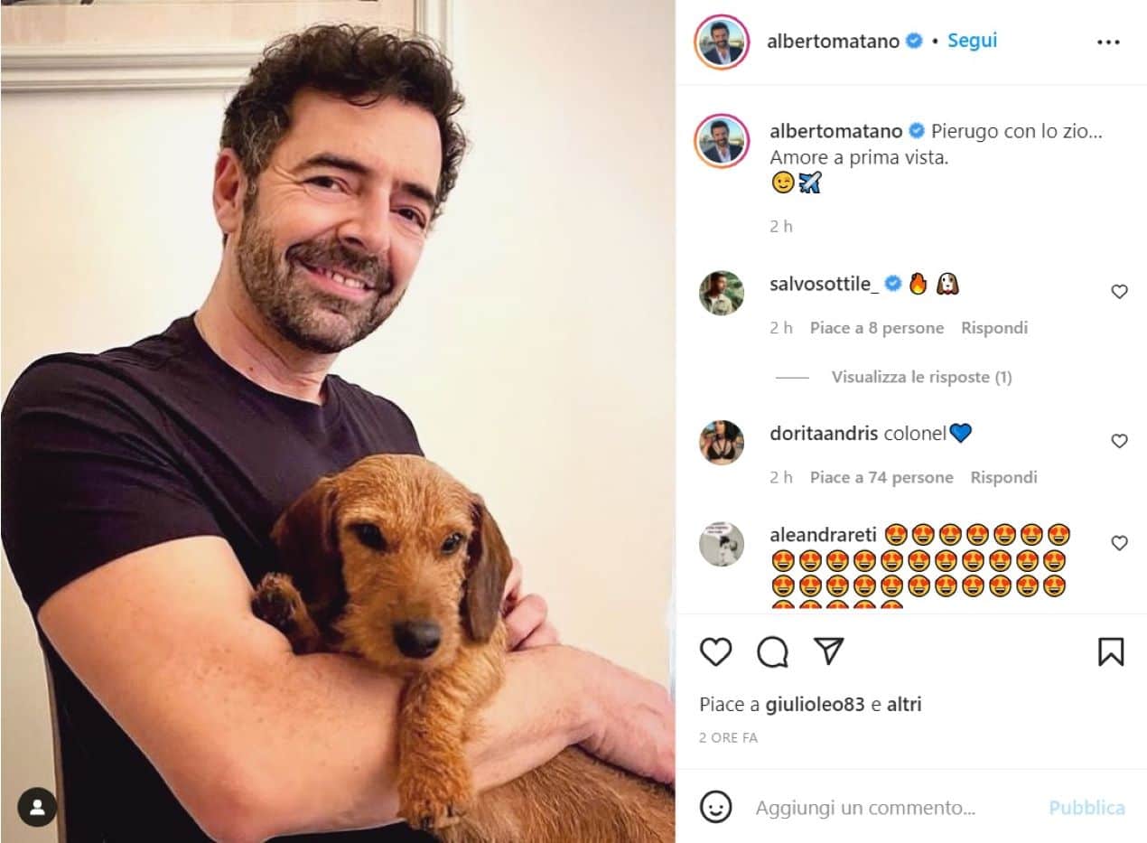 “Pierugo con lo zio… Amore a prima vista. 😉✈️”: così scrive Alberto Matano nell’ultimo post pubblicato e condiviso sul suo seguitissimo profilo Instagram. Chi era costui? A rivelarlo è la foto che accompagna il messaggio: un simpaticissimo cagnolino, un bassottino per la precisione. Tanto è bastato per mandare in visibilio i numerosissimi fan dell’ex mezzobusto del Tg1 (ma anche per far ingelosire più di una pretendente…).