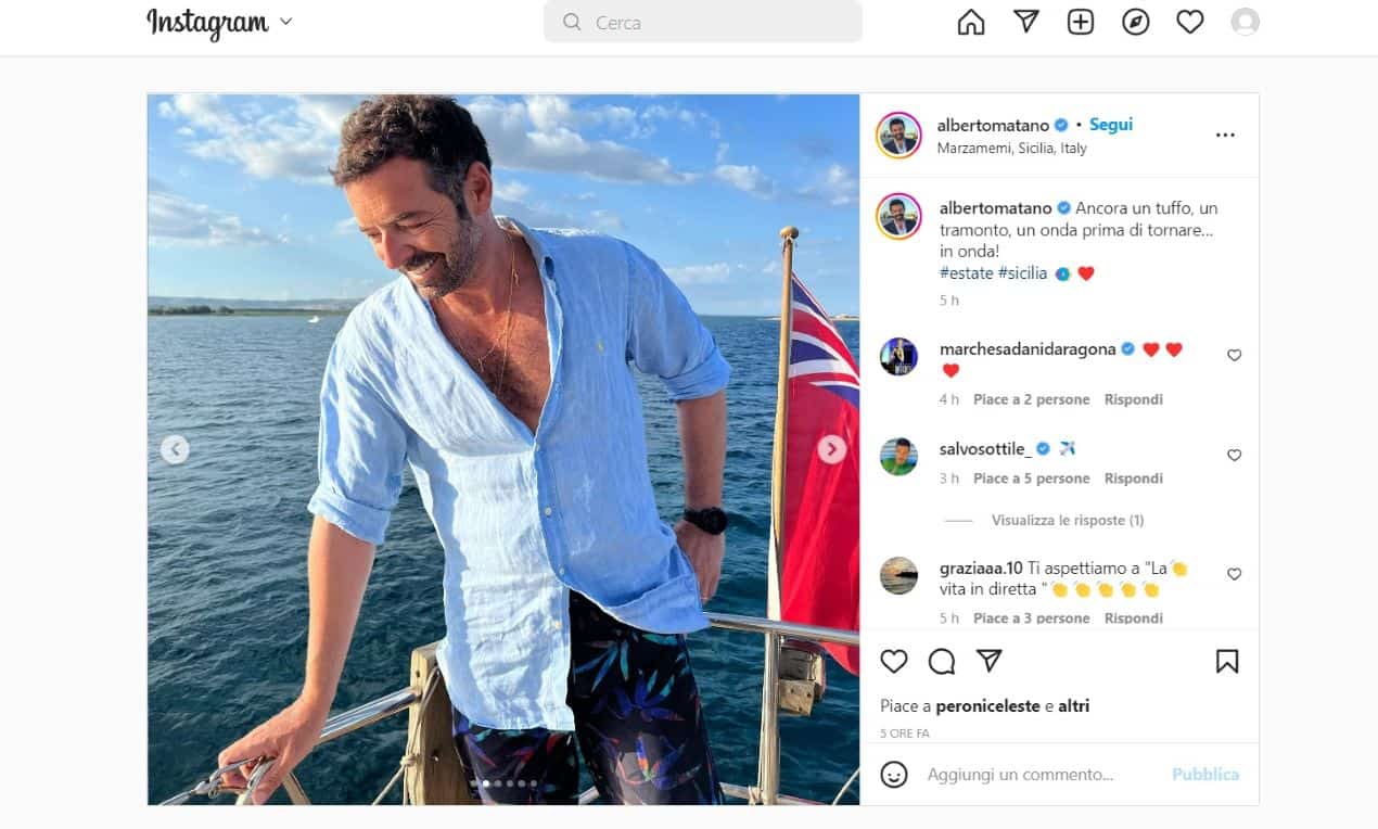 Vediamo subito al dunque. La didascalia del post incriminato, con una sestina di foto e video di scatti da far schiattare d’invidia chi è già tornato dalle vacanze, o, peggio ancora, chi non ci è andato proprio, Alberto Matano scrive, ormai con la scioltezza di un poeta consumato: “Ancora un tuffo, un tramonto, un onda prima di tornare… in onda!”. E giù gli hashtag #estate #sicilia 🐠❤️. Tutto bene? Non proprio.
