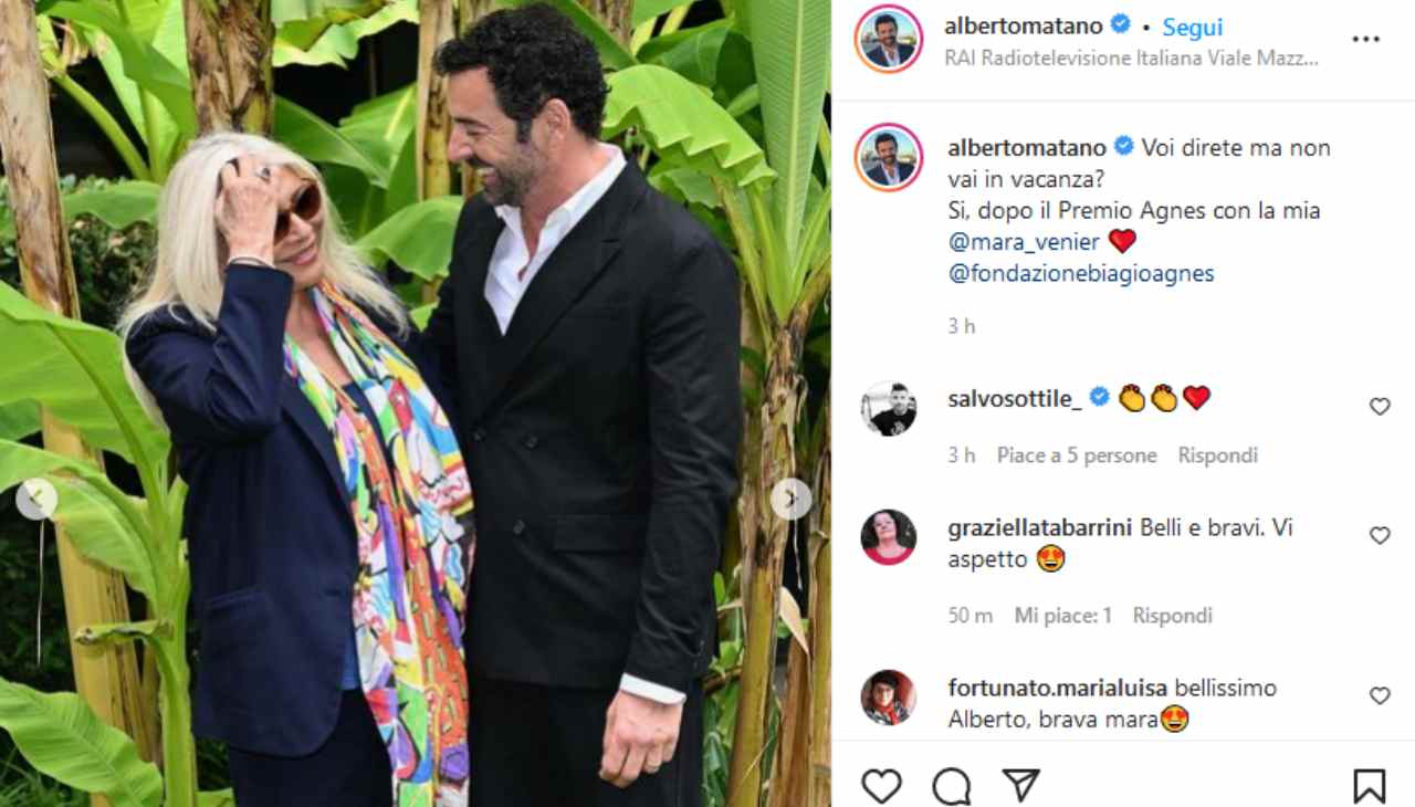 Dopo una giornata così importante e un favore così grande, Alberto non poteva non contraccambiare ed infatti oggi ha rinunciato alle vacanze estive con il compagno per essere insieme all’amica: “Voi direte ma non vai in vacanza? Si, dopo il Premio Agnes con la mia @mara_venier”. Insomma Matano non poteva ancora partire, non prima di accompagnare la Venier a quello che presumibilmente è l’ultimo evento ufficiale a cui parteciperà prima di dedicarsi completamente al marito Nicola Carraro. Chissà che non passino anche parte dell’estate insieme, dopo magari che Alberto avrà fatto la prima vacanza da sposo con l’uomo che ha conquistato il suo cuore ormai da diversi anni e a cui finalmente è stato dato un volto.
