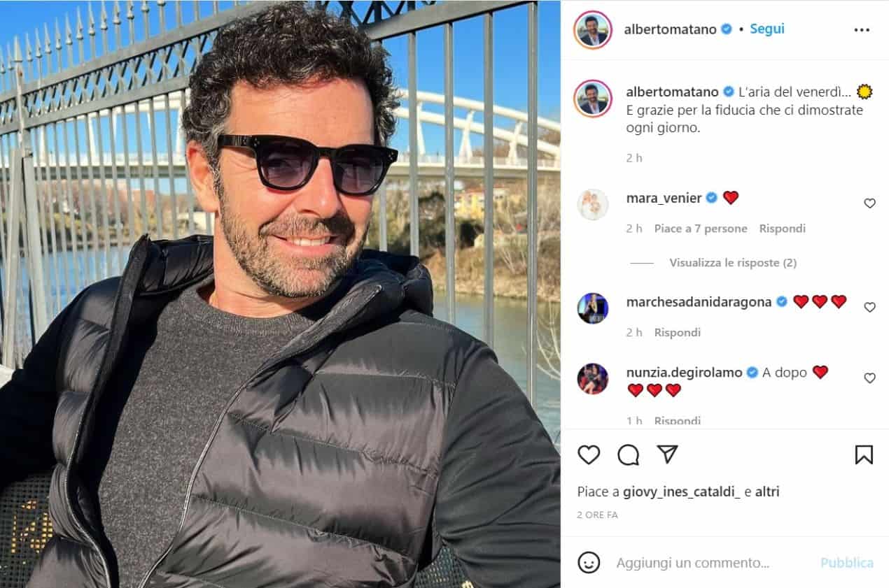 A giudicare dall’espressione sul suo volto, con un sorriso capace di far breccia anche sul più freddo dei follower, con lo spirito Alberto Matano è già alla stagione calda, anche se l’inverno è ancora tutto da attraversare: eccolo allegro e sorridente come un fiore mentre si prepara a un weekend rigenerante dopo le fatiche del lavoro settimanale.