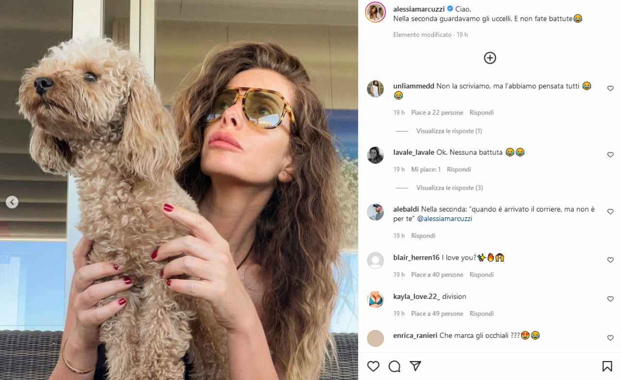 In realtà il motivo di quella posa è molto meno poetico e simbolico e lo svela Alessia Marcuzzi con un pizzico di consueta ironia e anche un po’ di malizia: “Ciao. Nella seconda guardavamo gli uccelli. E non fate battute”. Senza l’aggiunta finale probabilmente ci sarebbe stato qualcuno che non avrebbe pensato al doppio senso, ma visto che Alessia lo ha sottolineato gran parte dei commenti sono proprio rivolti al doppio senso che voleva non fosse palesato tra i commenti.