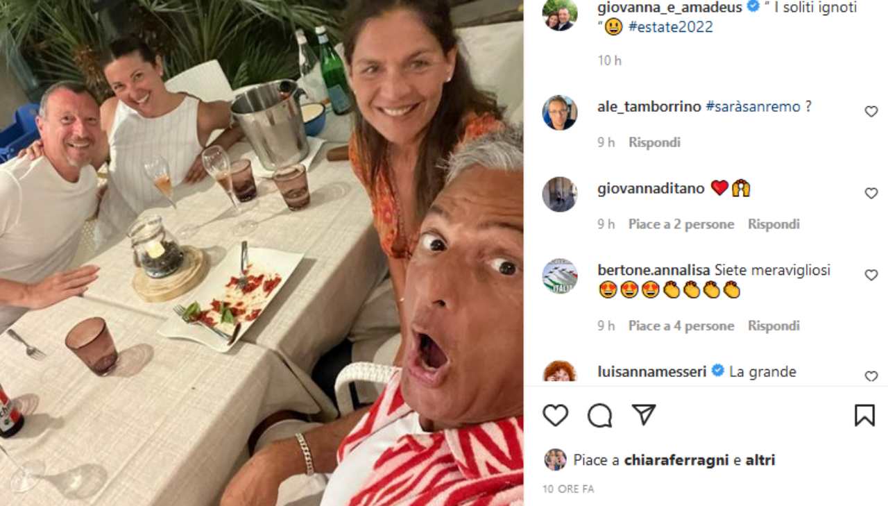 Tra una chiamata e l’altra, però, Amadeus si concede anche del tempo per il relax e gli amici. In questi giorni si trova insieme alla moglie Giovanna Civitillo e all’amico di sempre Rosario Fiorello. Ieri il conduttore ha postato un selfie scattato proprio da Fiore, nel quale li si vede alla fine di una cena a coppie con le rispettive mogli. Come didascalia della foto Amadeus scrive: “I soliti Ignoti”, giocando sul titolo della sua trasmissione quotidiana.