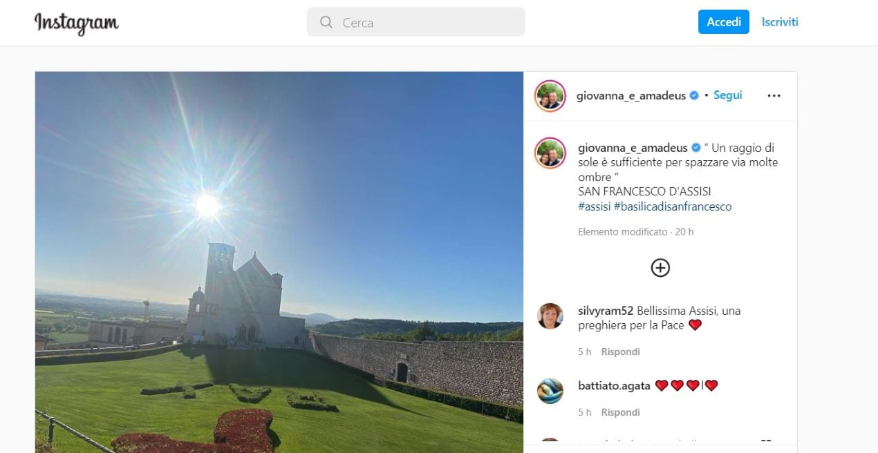 “Un raggio di sole è sufficiente per spazzare via molte ombre“ si legge nel post pubblicato alcune ore fa sul seguitissimo profilo Instagram di Amadeus e Giovanna Civitillo. Sullo sfondo la magnifica basilica superiore di San Francesco, con un magnifico prato verde bagnato dal caldo sole di questi giorni, il tau e la scritta “Pax” in primo piano.