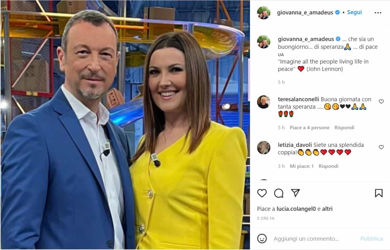 La citazione è evidentemente tratta dal celebre brano “Imagine” di John Lennon, brano tornato oltremodo d’attualità in queste ultime settimane, con la guerra che imperversa in Ucraina e tutto il carico di sofferenze, violenza e devastazioni che si trascina dietro. Le parole riportate da Amadeus e Giovanna Civitillo sono andate dritte al cuore degli ammiratori della coppia, che hanno in breve tempo reagito al post con migliaia di like e commenti affettuosi per il nobile messaggio.