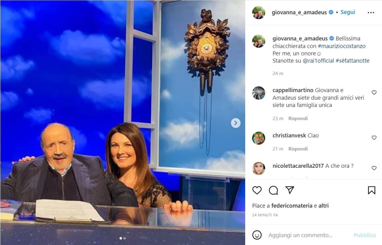 “Bellissima chiacchierata con #mauriziocostanzo Per me, un onore☺️ Stanotte su @rai1official #sèfattanotte“, si legge nel breve messaggio che accompagna il post. Ed è subito pioggia di commenti: “Giovanna è una Signora felice” osserva un fan. “Giovanna piaci x la tua semplicità 😍👏👏👏👏👏👏” chiosa un altro utente. E ancora: “Giovanna mi piace tanto la tua semplicità. Sei vera nei sentimenti, si vede dai tuoi occhi. Resta sempre cosi 👍🏻”. Gli hater a dire il vero non mancano, ma sono in netta minoranza…