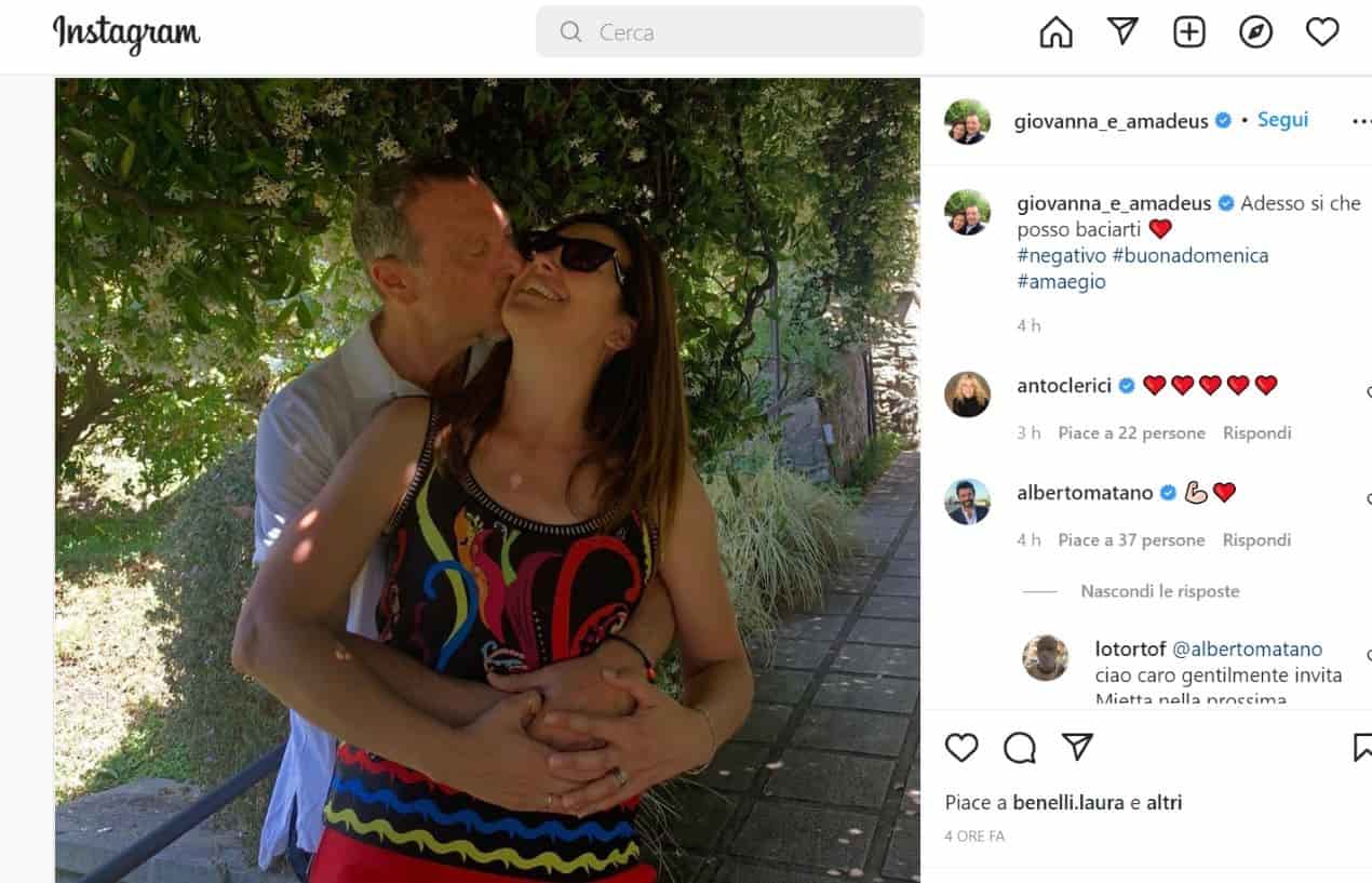 “Adesso si che posso baciarti ❤️”, si legge in un post pubblicato poco prima dell’ora di pranzo di questo rovente 3 luglio 2022 sul profilo Instagram di coppia, accompagnato da una foto di Amadeus che abbraccia teneramente la sua Giovanna Civitillo, baciandola, mano nella mano… E la notizia sta seminascosta tra gli hashtag: “#negativo #buonadomenica #amaegio“.