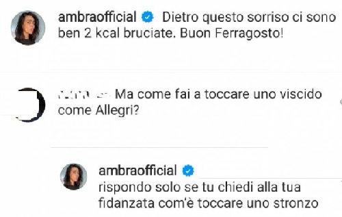 Teatro dell’accesa battaglia è stato Instagram: un utente in cerca di guai ha domandato in calce a uno degli ultimi post di Ambra Angiolini come si “potesse toccare un viscido come Allegri”. Apriti cielo. L’ex ragazza di Non è la Rai e l’allenatore della Juventus sono legati sentimentalmente ormai da anni, e un’offesa del genere non poteva restare impunita.