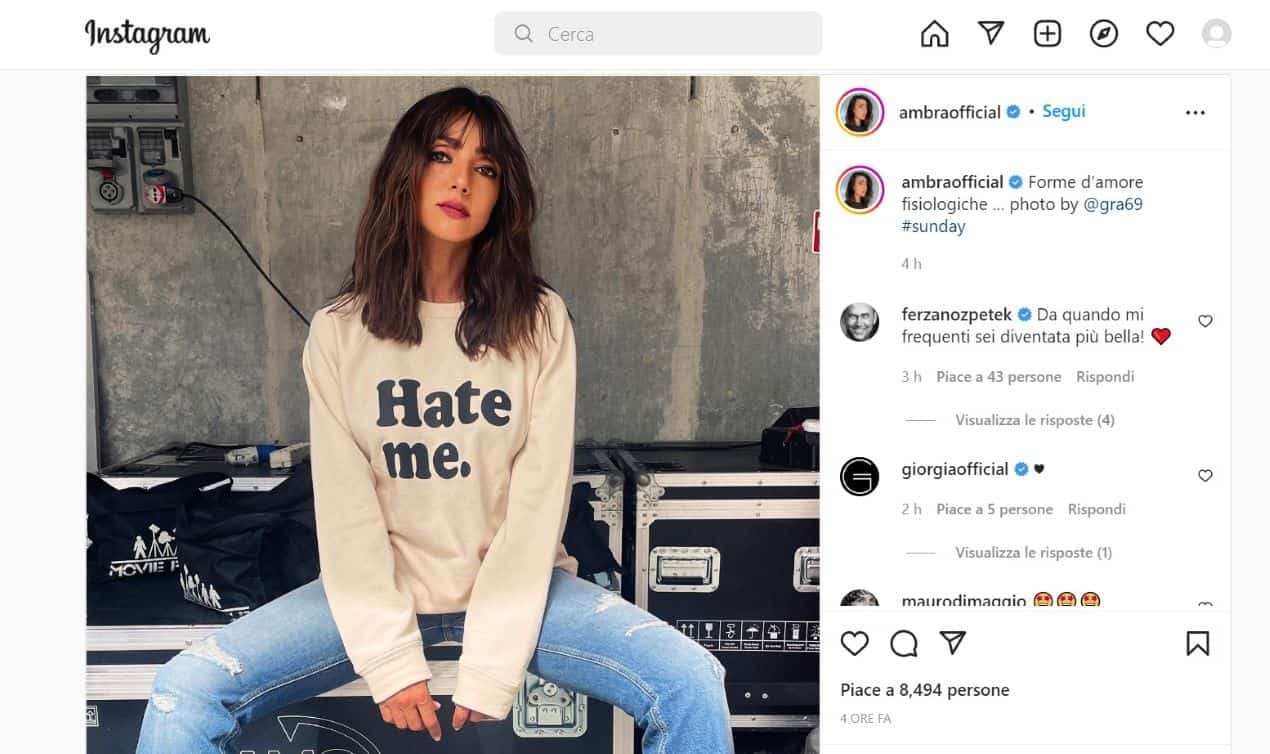“Forme d’amore fisiologiche …”: così scrive Ambra Angiolini nell’ultimo post pubblicato sul suo seguitissimo profilo Instagram, e mai come in questo caso la foto di corredo (by @gra69 #sunday, come precisa la stessa Ambra dando a Cesare quel che è di Cesare) risulta indispensabile per cogliere il messaggio. La Nostra indossa infatti una felpa (con buona pace delle roventi temperature di quest’ultimo giorno di luglio) con su scritto “Hate me”, odiatemi. Una provocazione bell’e buona…