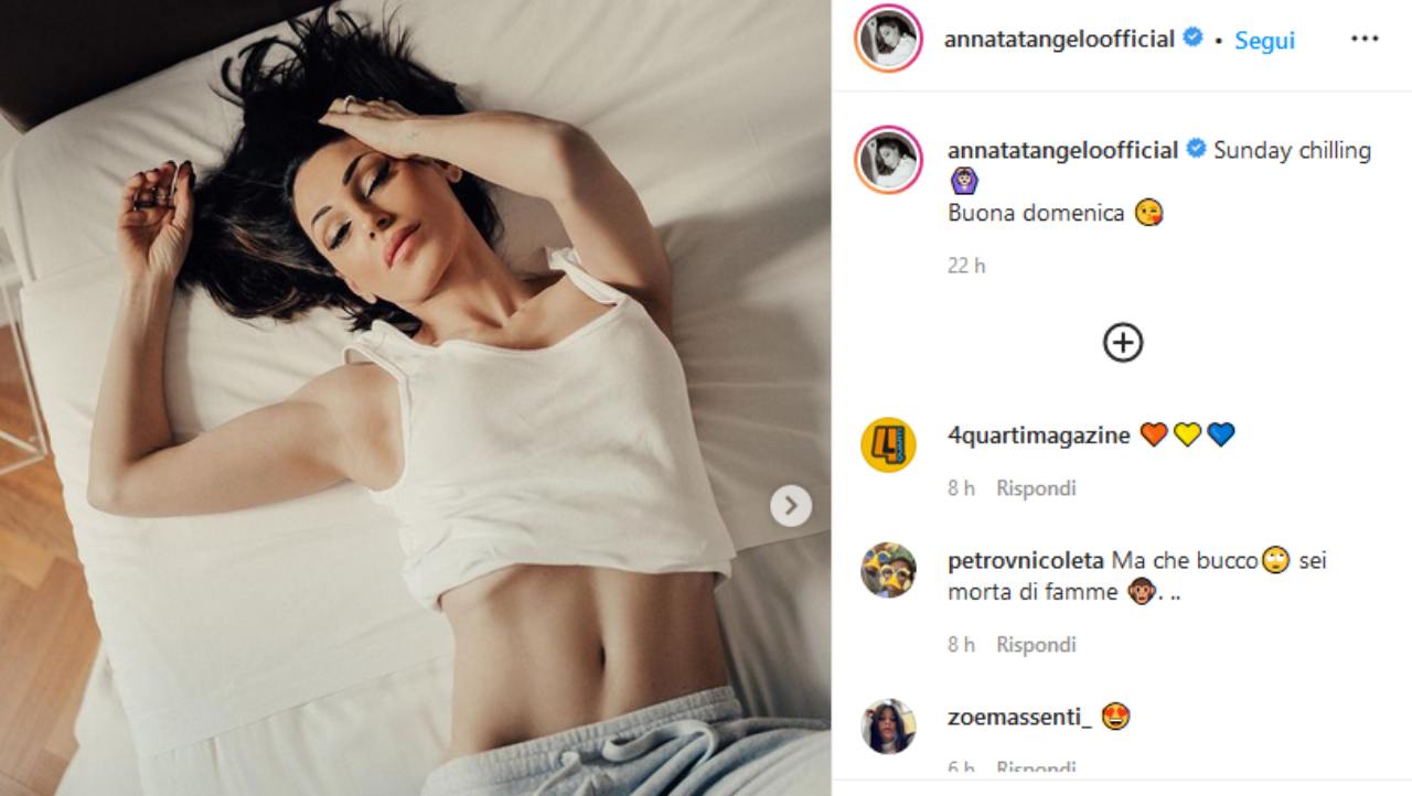 Come qualsiasi artista di questo periodo, ovviamente Anna Tatangelo condivide parte della sua vita sui social, anche di quella privata. Ieri la cantante ha pubblicato una serie di scatti in pigiama, dal letto. Foto ad alto tasso di sensualità che non hanno lasciato indifferenti tutti i suoi fan, sempre prodighi di complimenti e lusinghe per la bella campana.