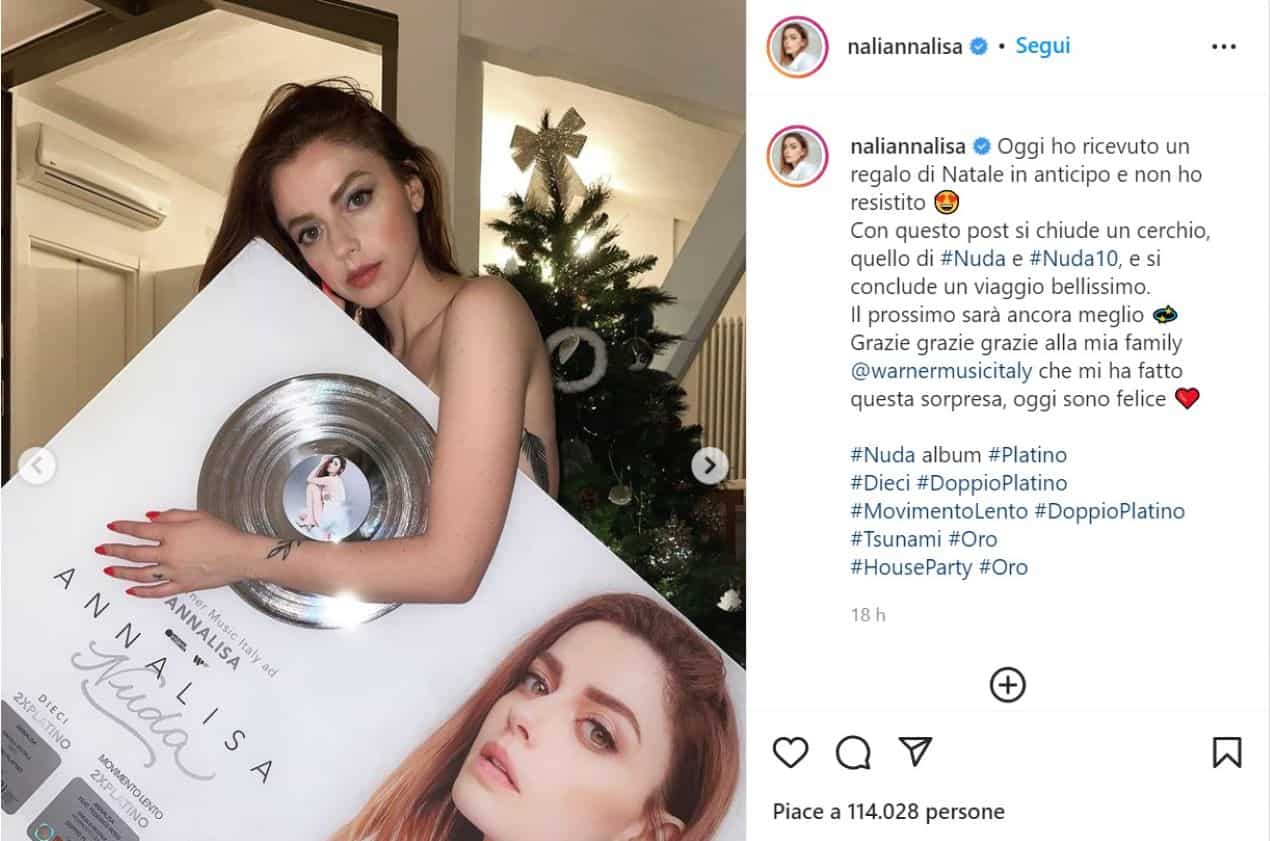 “Oggi ho ricevuto un regalo di Natale in anticipo e non ho resistito 😍” scrive Annalisa nel suo ultimo post su Instagram. E aggiunge: “Con questo post si chiude un cerchio, quello di #Nuda e #Nuda10, e si conclude un viaggio bellissimo. Il prossimo sarà ancora meglio 💫 Grazie grazie grazie alla mia family @warnermusicitaly che mi ha fatto questa sorpresa, oggi sono felice ❤️”.