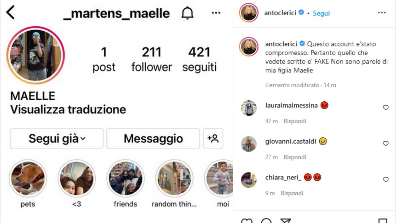 Nel post Antonella mostra la foto profilo ed il nome dell’account, quindi accanto scrive: “Questo account e’stato compromesso. Pertanto quello che vedete scritto e’ FAKE Non sono parole di mia figlia Maelle”. Si è trattato di un gesto protettivo, teso ad evitare che qualcuno potesse scagliarsi contro la figlia nel caso in cui i contenuti pubblicati sull’account fossero controversi o generassero discussioni.