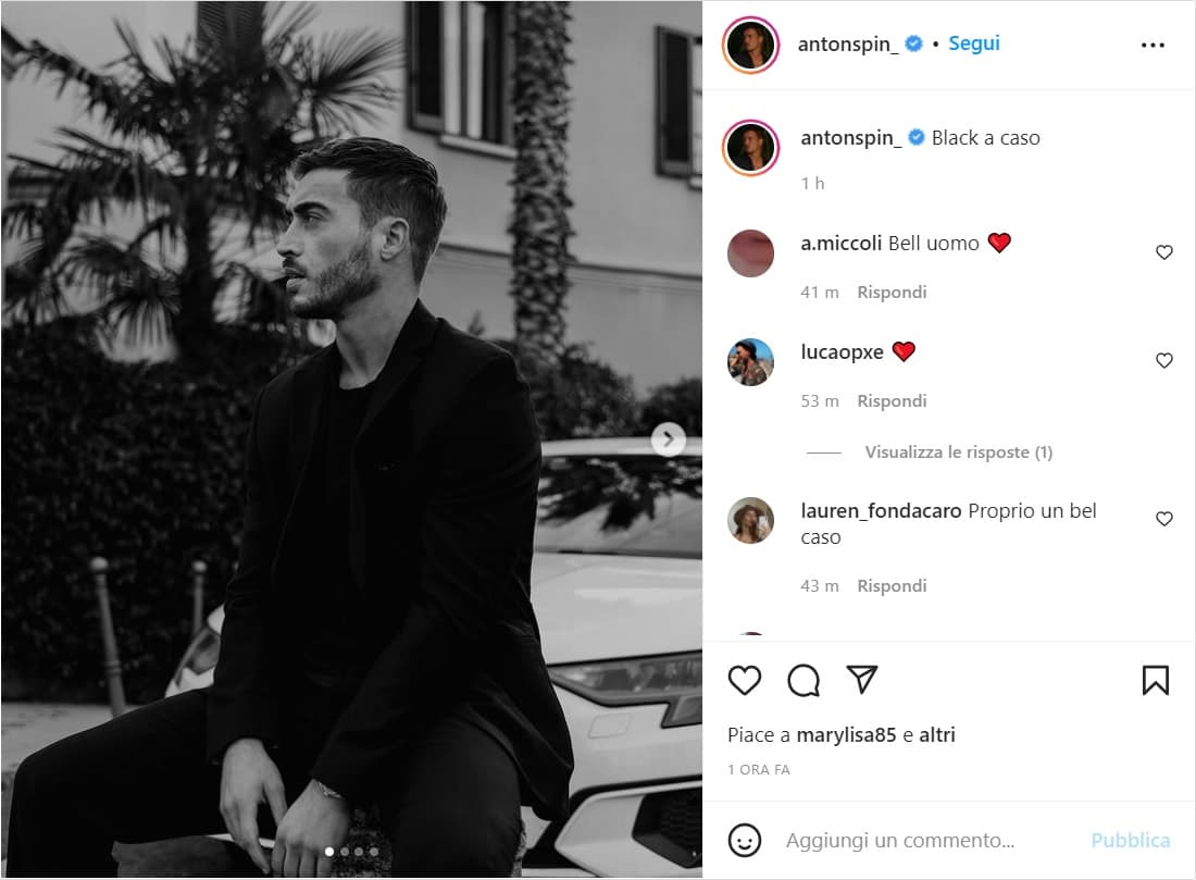 “Black a caso” scrive Antonino Spinalbese nell’ultimo post pubblicato sul suo seguitissimo profilo Instagram, accompagnando lo stringato ma efficace messaggio con una serie di immagini che danno conto di una “evoluzione” del personaggio non solo sul piano del look, ma anche, verosimilmente, sul piano sentimentale. Il primo scatto, in bianco e nero, mostra infatti il Nostro in versione total black, bello e impossibile come i modelli di certe pubblicità d’alta moda.