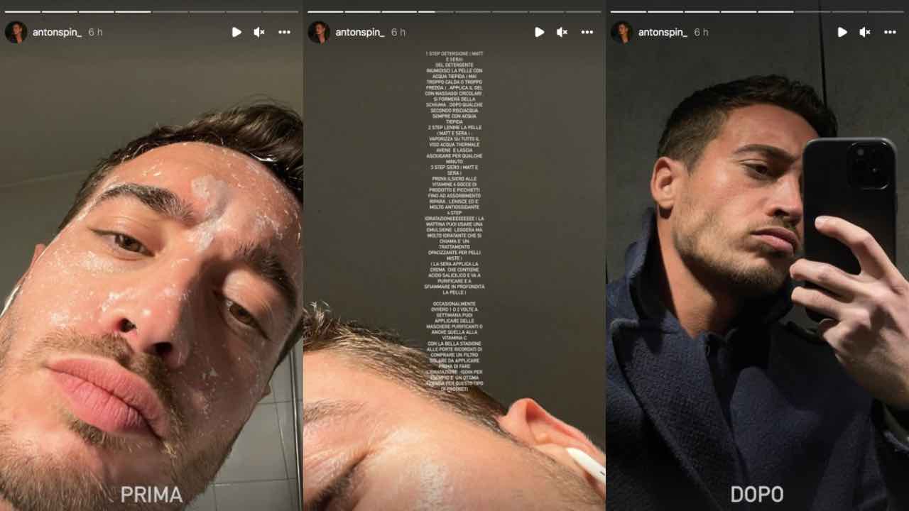 Sembra che, dopo aver ricevuto infiniti commenti sulla sua bellezza, Spinalbese abbia deciso di condividere con il pubblico la sua ‘routine di bellezza’. Prima tra le storie, dove il parrucchiere ha scritto tutti i passaggi meticolosamente. Quattro step in tutto (che troverete qui sotto tra le fotografie): “Occasionalmente, ovvero una o due volte a settimana, puoi applicare delle maschere purificanti” aggiunge poi l’uomo. “Con la bella stagione alle porte ricordati di comprare un filtro solare da applicare prima di fare l’idratazione”. Antonino poi aggiunge anche il nome di alcune marche che potrebbero piacere al pubblico.