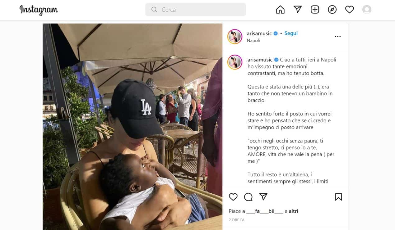 “Ciao a tutti – scrive Arisa in un post pubblicato qualche ora fa sul suo cliccatissimo profilo Instagram -, ieri a Napoli ho vissuto tante emozioni contrastanti, ma ho tenuto botta. Questa è stata una delle più (..), era tanto che non tenevo un bambino in braccio. Ho sentito forte il posto in cui vorrei stare e ho pensato che se ci credo e m’impegno ci posso arrivare ‘occhi negli occhi senza paura, ti tengo stretto, ci penso io a te, AMORE, vita che ne vale la pena (per me )’. Tutto il resto è un’altalena, i sentimenti sempre gli stessi, i limiti pure. Che palle. Ci vediamo stasera a #procida. Non mancate”.