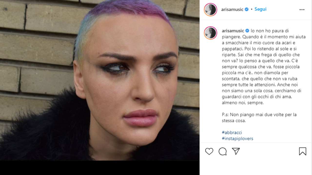 I social non devono essere sempre uno strumento per mostrare solo le gioie della vita e i momenti belli. Sebbene spesso si tenda a voler far vedere al mondo unicamente le cose positive, a volte fa anche bene mostrare le proprie debolezze. Lo ha capito molto bene pure Arisa: la cantante, infatti, ha recentemente pubblicato sulla sua pagina Instagram un post che ha avuto molto riverbero. Il tutto è nato da una riflessione sul pianto, uno di quei meccanismi che il nostro corpo attiva in diversi momenti e con funzionalità diverse. Nonostante sia una cosa del tutto naturale, sfortunatamente nella società di oggi non è sempre ben visto e questo rischia di creare un circolo vizioso che può portare anche gravi danni ai singoli e alla società. Per questo il messaggio di Arisa è molto importante.
