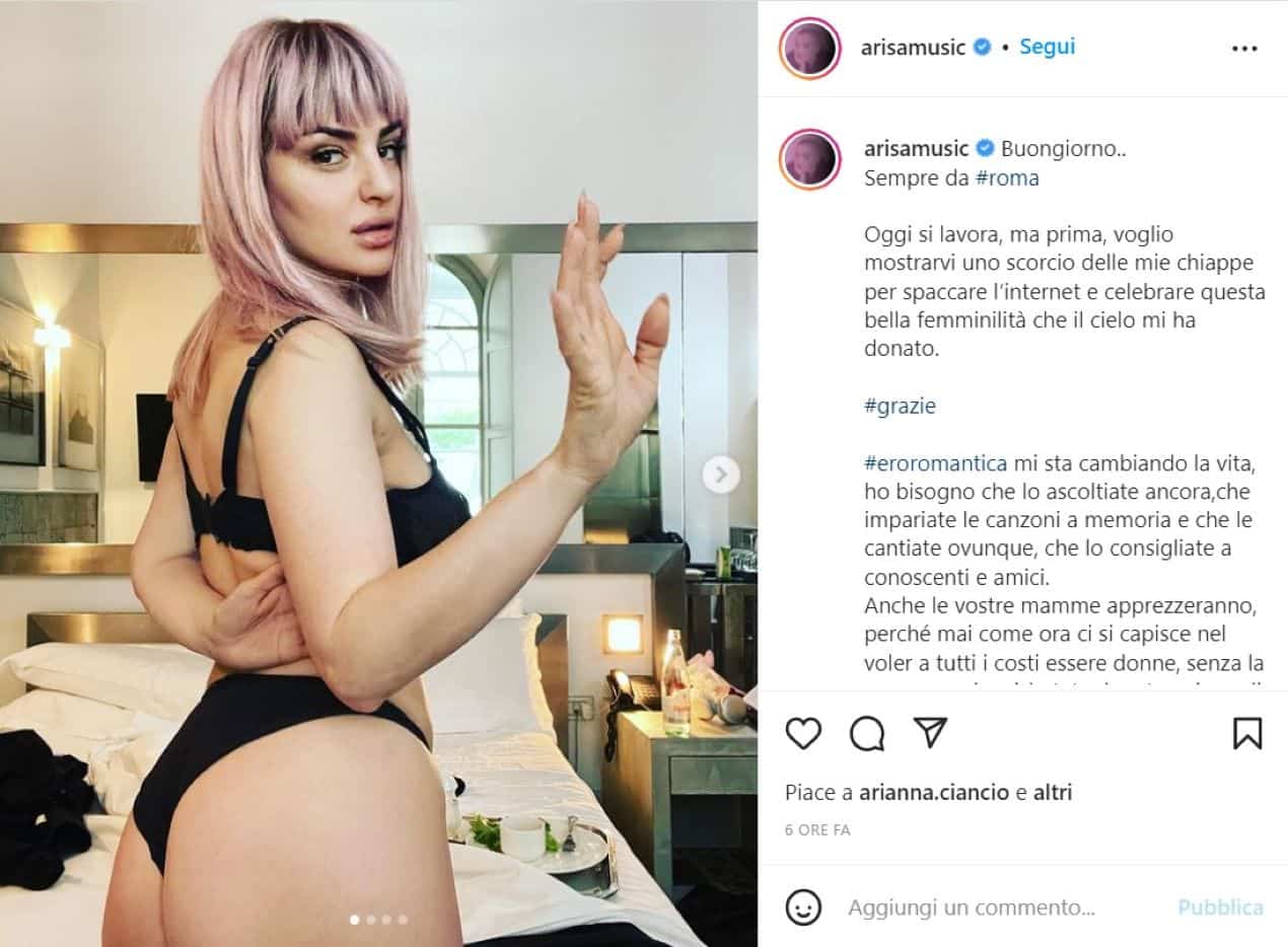 “Buongiorno.. Sempre da #roma”, esordisce Arisa. “Oggi si lavora, ma prima, voglio mostrarvi uno scorcio delle mie chiappe per spaccare l’internet e celebrare questa bella femminilità che il cielo mi ha donato. #grazie”.
