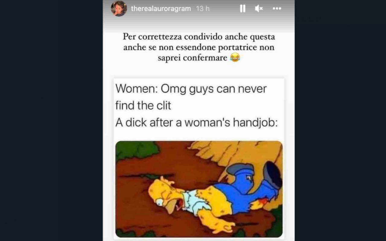 In una delle ultime stories pubblicate da Aurora su Instagram si legge una frase che fa parte di un meme in difesa delle abilità sessuali degli uomini. Tra le convinzioni condivise c’è quella secondo cui gli uomini siano incapaci di trocare il punto g di una donna e riuscire dunque a darle piacere. Il meme ironizza su questa situazione/convinzione, sottolineando che comunque dall’altro lato non sia tutto perfetto.