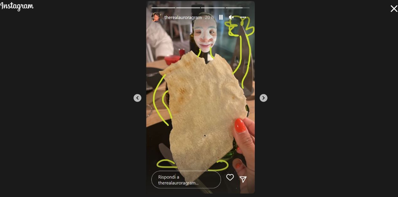 Lo scatto incriminato mostra il volto di Aurora Ramazzotti in miniatura, coperto da quella che sembrerebbe una maschera di bellezza realizzata con una crema bianca, col nasone e la bocca sagomati che ricordano quelli di un clown. E sotto una sorta di “saio” composto da nient’altro che un pezzo di schiacciatina… Evidentemente ci troviamo in un ristorante, o comunque a tavola. Collo, braccia e piedi, invece, sono semplicemente tracciati con un pennarello giallo fosforescente. Un’opera d’arte contemporanea, non c’è che dire!