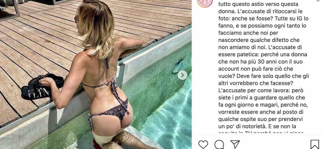 Come noto, la famosa conduttrice di Canale 5 in questi giorni è in vacanza, si gode il sole e l’acqua della piscina in un clima di assoluto relax, dopo le fatiche dell’ultima stagione televisiva, e ovviamente non dimentica di stuzzicare i suoi fan e followers con foto più o meno provocanti…