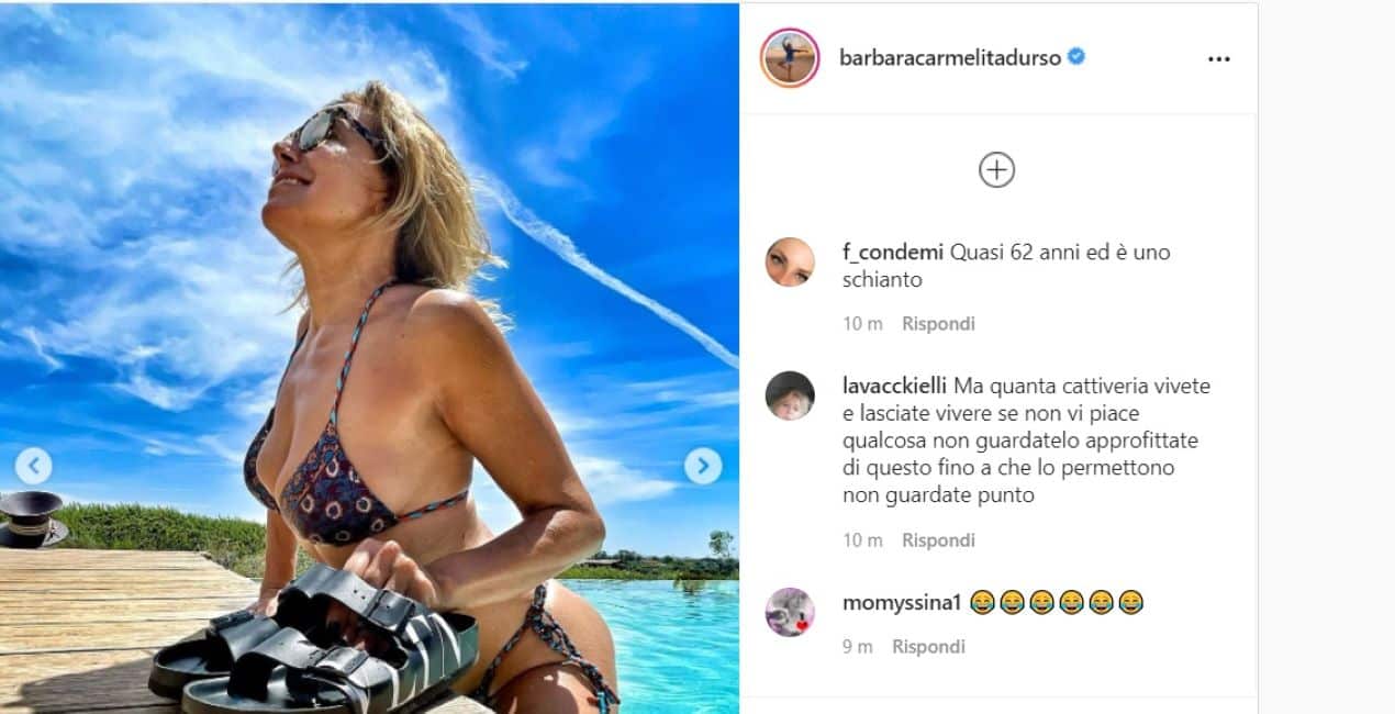 L’ultima serie di foto, fresca di giornata, mostra in particolare Barbara D’Urso di spalle, in audace bikini, con il corpo immerso nell’acqua solo per metà. La piscina lambisce i glutei della conduttrice cult, senza però coprire completamente il lato B… Ed è qui che il suo pubblico virtuale si scatena.