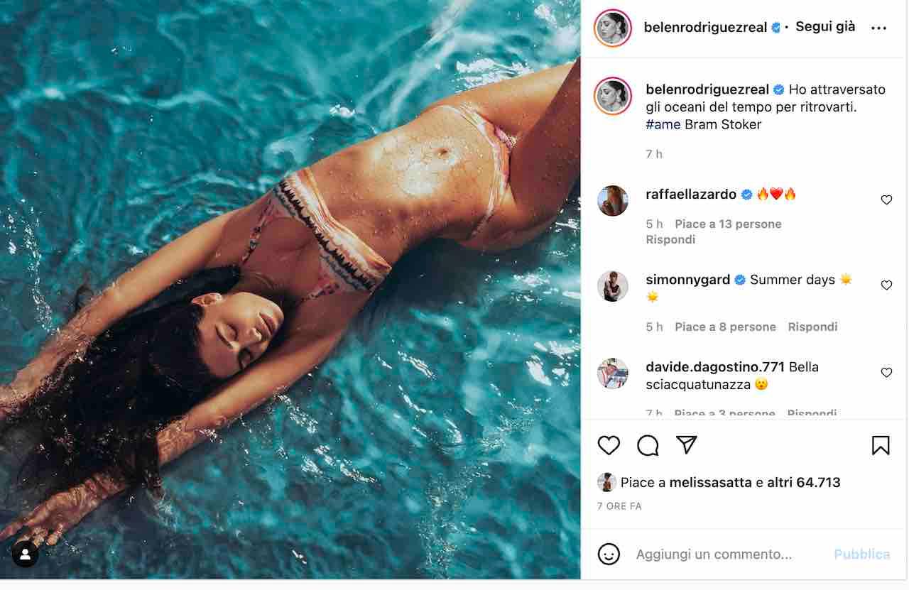 Non a caso sul web Belen Rodriguez è una delle bellezze più cercate e cliccate. Su Instagram, tanto per rendere l’idea, vanta la bellezza di oltre 10 milioni di followers, che reagiscono estasiati a ogni nuova immagine pubblicata dalla loro beniamina. Così è stato anche per l’ultimo scatto che la ritrae distesa in acqua, per l’appunto come una sirena, con indosso un costume che esalata le sue forme sinuose e ammalianti più che mai. La scollatura non può non risaltare in primo piano, lasciando tutti senza parole. E’ forse uno degli scatti di Belen più belli che si siano mai visti sul web, e la pioggia di like e di complimenti non ha tardato a manifestarsi. Vedere per credere.
