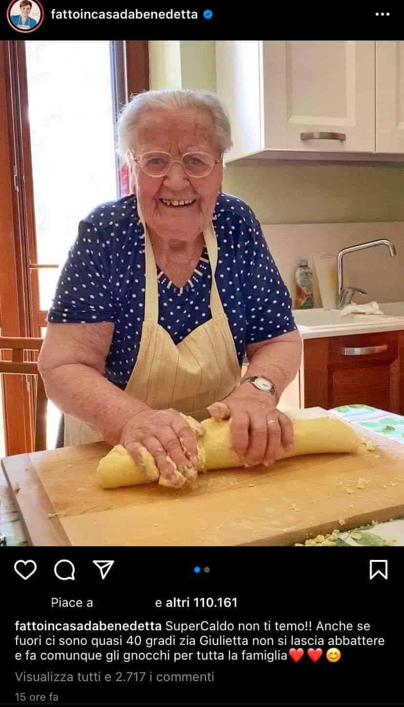 È apparsa poche ore fa su Instagram la foto che ha toccato il cuore dei follower della Rossi. La protagonista dello scatto, questa volta, non è Benedetta bensì zia Giulietta. L’anziana signora, minuta di grembiule da cucina e tagliere, è stata immortalata mentre con amore impasta gli gnocchi e timidamente sorride verso la fotocamera.