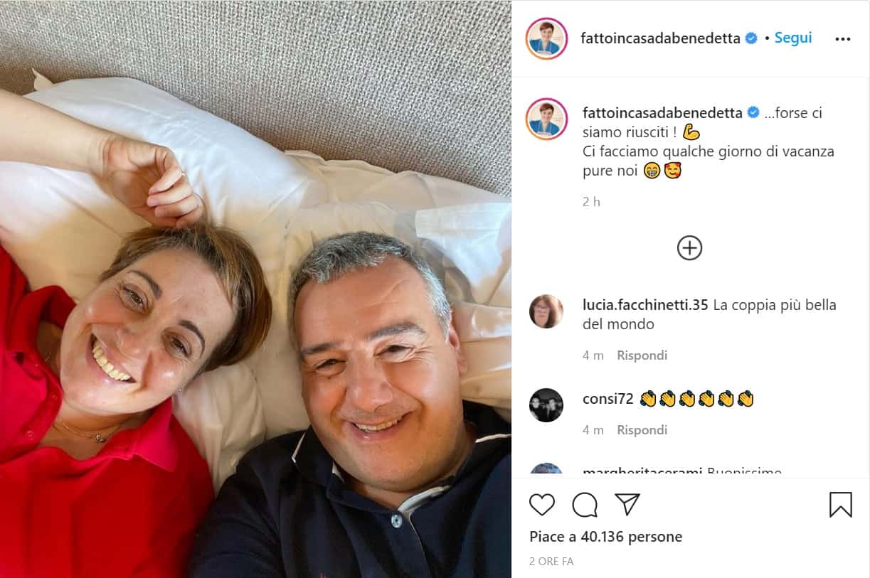 Benedetta Rossi si lascia immortalare in primo piano, serena e sorridente, accanto all’uomo della sia vita (nonché fido collaboratore) Marco Gentili: entrambi sono sdraiati a letto e hanno gli occhi luccicanti di due giovani fidanzatini. Ovviamente dal pubblico virtuale della foodblogger è subito partita una calorosissima “ola”.