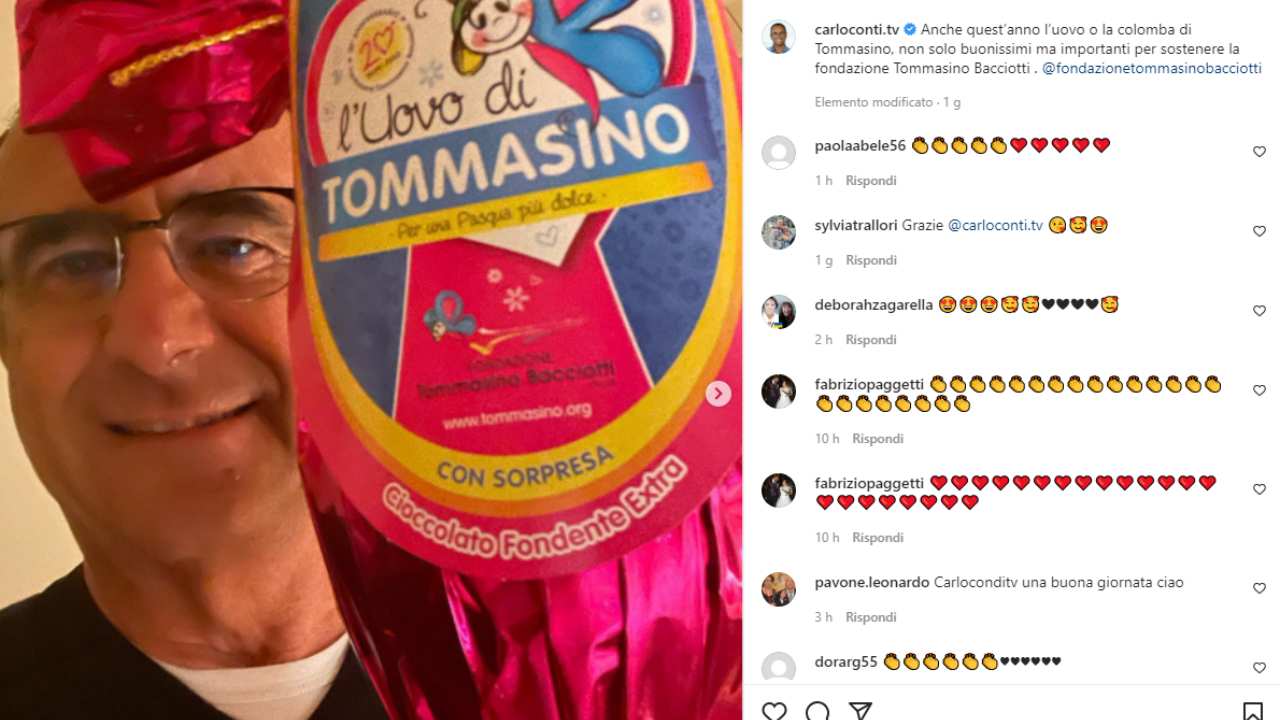 L’ultima causa che ha sposato Carlo Conti è un’iniziativa lanciata da una nota associazione per il periodo pasquale. Nel post si legge: “Anche quest’anno l’uovo o la colomba di Tommasino, non solo buonissimi ma importanti per sostenere la fondazione Tommasino Bacciotti“. Il conduttore si mostra con in mano l’uovo di Pasqua che chiunque può comprare per aiutare la fondazione a raggiungere l’ennesimo obiettivo per la ricerca sul tumore cerebrale infantile.