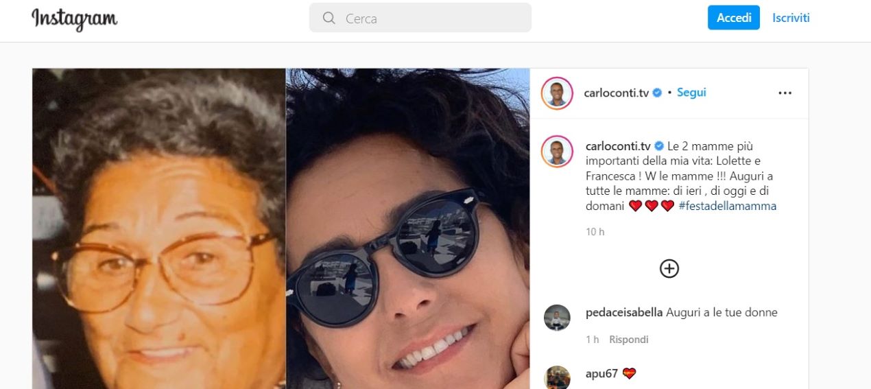 “Le 2 mamme più importanti della mia vita: Lolette e Francesca ! W le mamme !!! Auguri a tutte le mamme: di ieri, di oggi e di domani”: così scrive Carlo Conti nel post pubblicato quest’oggi sul suo seguitissimo profilo Instagram, con un tris di cuori rossi tutti per le donne che tanto ama: ❤️❤️❤️. E l’immancabile hashtag #festadellamamma.