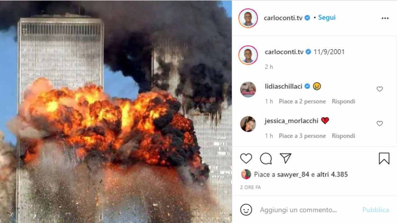 Oggi, 11 settembre 2021, ricorre il ventennale dalla caduta delle torri gemelle: un evento che ha cambiato per sempre non solo l’America ma il mondo intero. Vista l’importanza che quei fatti ebbero, forse anche e soprattutto sul mondo occidentale, è normale che siano in molti a voler ricordare quanto accaduto. Tra questi, anche Carlo Conti ha voluto dedicare un momento per condividere su Instagram una delle foto simbolo di questo evento: le torri in fiamme dopo che il primo aereo vi si era schiantato contro. Quella è una delle immagini che forse più di tutte è impressa nella memoria di chi ha vissuto quell’evento. Anche per questo Carlo Conti, non volendo forse fare mera retorica, ha pubblicato la foto scrivendo solo la data: 11/9/2001.