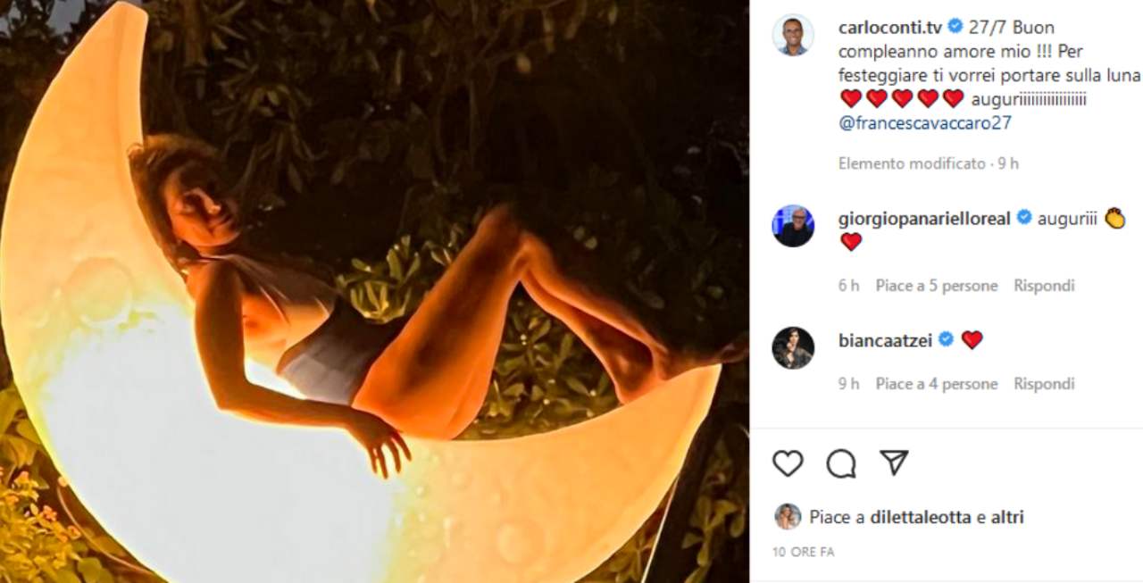 Come augurio di buon compleanno, Conti ha pubblicato una foto della moglie in costume, sdraiata sopra una lampada a forma di luna. Agli auguri ha poi aggiunto una dedica che sa di dichiarazione d’amore: “Buon compleanno amore mio !!! Per festeggiare ti vorrei portare sulla luna”. Parole che hanno fatto sciogliere il cuore a tutte le sue fan, emozionate nel vedere quanto amore il loro idolo provi per la compagna di vita.