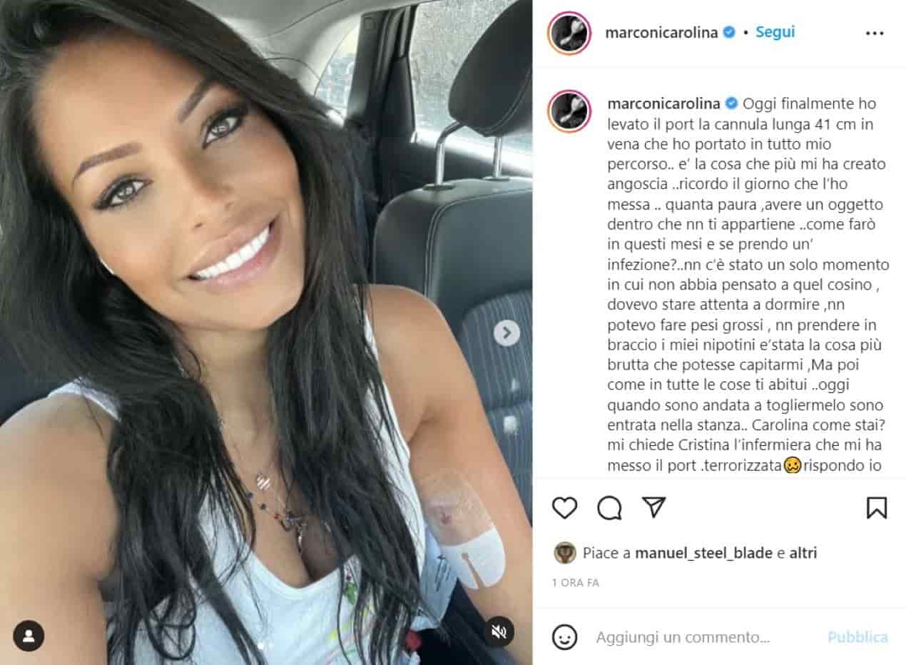 Carolina Marconi racconta esattamente com’è andata: “Oggi quando sono andata a togliermelo sono entrata nella stanza.. Carolina come stai? mi chiede Cristina l’infermiera che mi ha messo il port .terrorizzata🥴rispondo io 😁..lei mi rassicura con il suo sguardo dolce mi chiede di sdraiami sul lettino e darle il braccio ..(doveva anestetizzarmi )allora giro la testa dall’altro lato e stringo forte la mano dell’altra infermiera Laura ..crollo in un pianto senza riuscire a controllarmi ..come fosse un pianto liberatorio ..ripensavo a tutti questi mesi di sofferenza e nn potevo credere che tutto questo stava finendo ..questa cannula avrebbe rappresentato la fine di questo lunghissimo percorso.. il più duro della mia vita”.