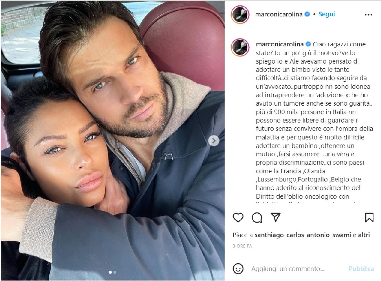 “Ciao ragazzi come state?”, esordisce Carolina Marconi nel suo lungo e appassionato post. “Io un po’ giù il motivo? Ve lo spiego io e Ale avevamo pensato di adottare un bimbo visto le tante difficoltà..ci stiamo facendo seguire da un’avvocato..purtroppo nn sono idonea ad intraprendere un ‘adozione xche ho avuto un tumore anche se sono guarita.. più di 900 mila persone in Italia nn possono essere libere di guardare il futuro senza convivere con l’ombra della malattia e per questo è molto difficile adottare un bambino ,ottenere un mutuo ,farsi assumere ..una vera e propria discriminazione..”.
