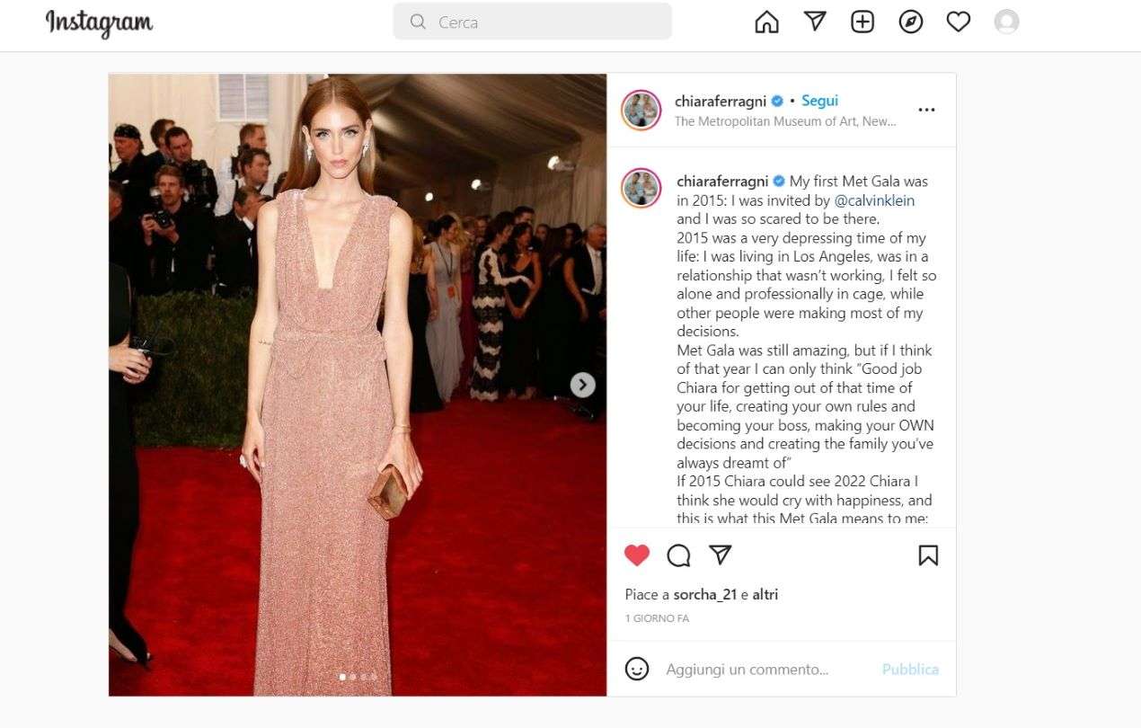 “Il mio primo Met Gala è stato nel 2015: sono stata invitata da Calvin Klein e avevo tanta paura di essere lì” racconta Chiara Ferragni in un lungo post, scritto in inglese, sul social network che ha fatto e continua a fare la sua fortuna. “Il 2015 – prosegue – è stato un periodo molto deprimente della mia vita: vivevo a Los Angeles, avevo una relazione che non funzionava, mi sentivo così sola e professionalmente in gabbia, mentre altre persone prendevano la maggior parte delle mie decisioni. Se penso a quell’anno posso solo dire: brava Chiara per essere uscita da quel periodo della tua vita, creando le tue regole e diventando il capo di te stessa, prendendo le tue decisioni e creando la famiglia che hai sempre sognato”.