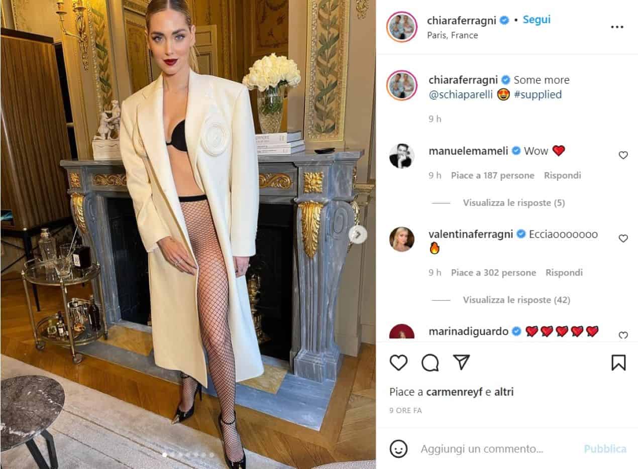 “Some more @schiaparelli 😍 #supplied“, scrive Chiara Ferragni nel suo messaggio social. E così, dopo aver posato con un abito senza reggiseno, la fashion blogger si mostra in un albergo di Parigi, dove si trova per la Paris Fashion Week, con indosso solo un cappotto bianco largo e un paio di calze a rete, ancora una volta per il brand Schiaparelli. Sotto il cappotto nulla (a parte il reggiseno nero e i collant): degli slip neppure l’ombra.