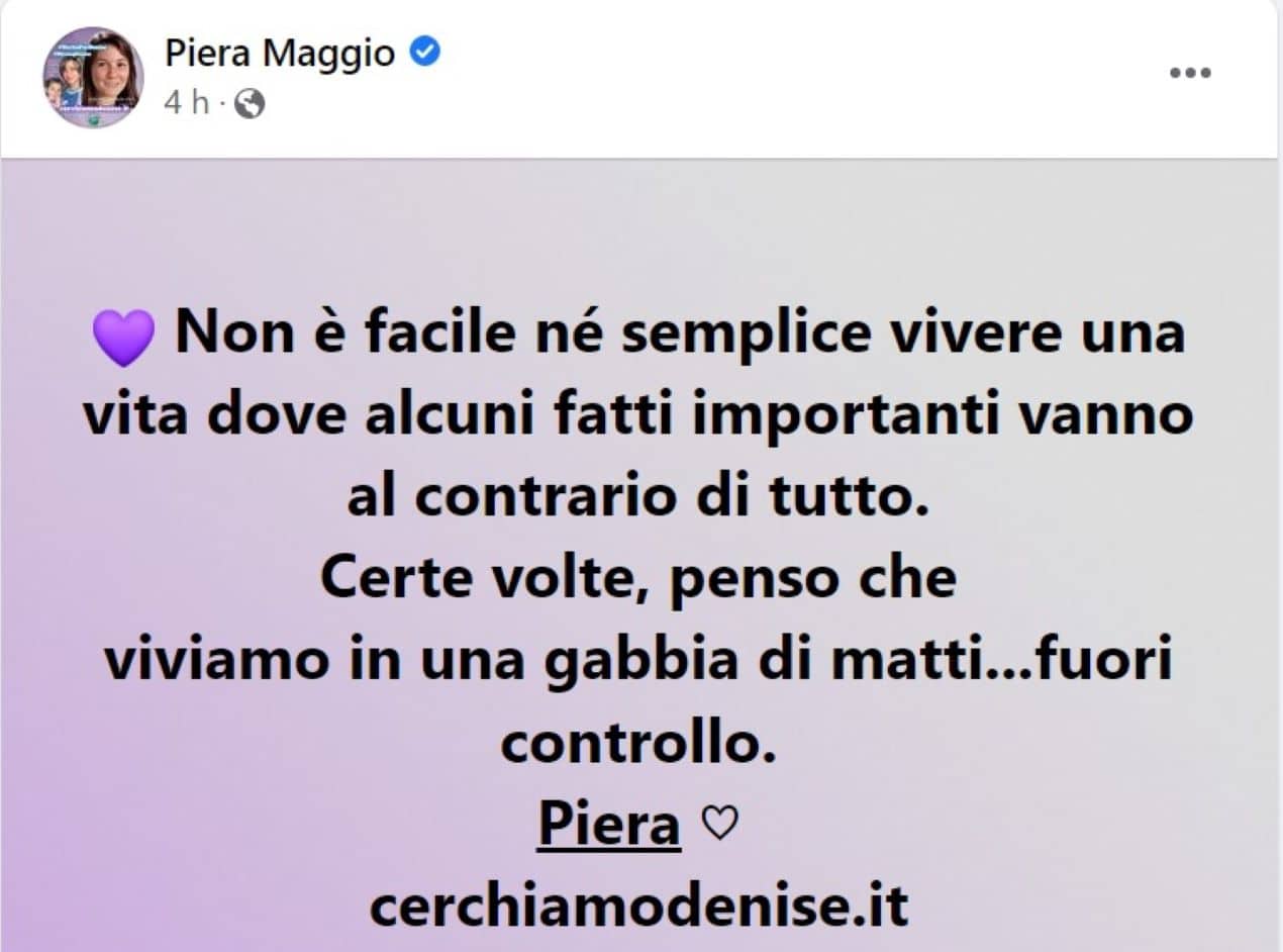 “Non è facile né semplice – ha appena scritto Piera Maggio – vivere una vita dove alcuni fatti importanti vanno al contrario di tutto. Certe volte, penso che viviamo in una gabbia di matti…fuori controllo”. Firmato: “Piera ♡”, con il consueto link al sito creato per rintracciare sua figlia Denise: “http://cerchiamodenise.it”.