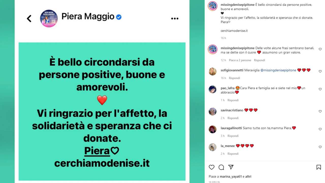 Un messaggio che ha commosso tutti i suoi follower e che dimostra quanto Piera Maggio apprezzi l’affetto e il sostegno ricevuto in questi anni. Tra i commenti più significativi ci sono quelli di persone che la incitano ad andare avanti e quelli di chi le fanno capire che Denise in questi anni è diventata una figlia adottiva per tutti gli italiani.