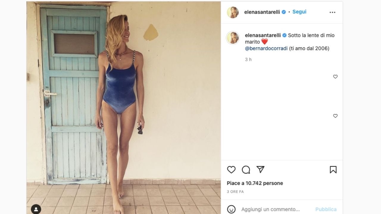 Gli ultimi giorni trascorsi insieme al marito e ai figli avevano come obiettivo un po’ di sano relax, ma pare che i piani siano cambiati in corso d’opera. La Santarelli si è lasciata fotografare in spiaggia tra le cabine di uno stabilimento mentre indossa un costume intero che le calza a pennello. Una foto da vero professionista se non fosse che a scattarla è stato il marito, Bernardo: “Sotto la lente di mio marito. Ti amo dal 2006“, con queste parole la modella condivide con i suoi fan la fotografia. Saranno stati gli occhi dell’amore a rendere la foto cosi? Oppure dietro quella breve frase, Elena sta comunicando che il marito Corradi non la perde mai d’occhio?! Questo non lo sapremo mai.