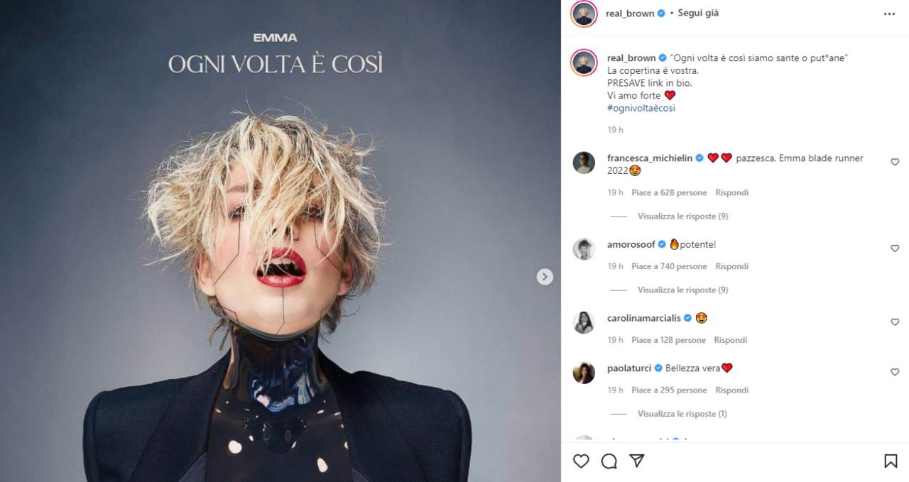 Sulla stessa strada sembra sia diretto il suo ultimo lavoro discografico. Qualche ora fa la cantante ha pubblicato la cover dell’ultimo album intitolato ‘Ogni volta così‘. Come immagine vediamo la sempre splendida Emma con indosso una giacca sopra al corpo nudo coperto di pittura nera. Accanto allo scatto la cantante scrive: “Ogni volta è così siamo sante o put*ane”. Il messaggio di denuncia sociale appare evidente, così come l’anticipazione di un lavoro artistico che mette a frutto questa voglia di farsi portavoce delle istanze delle donne.