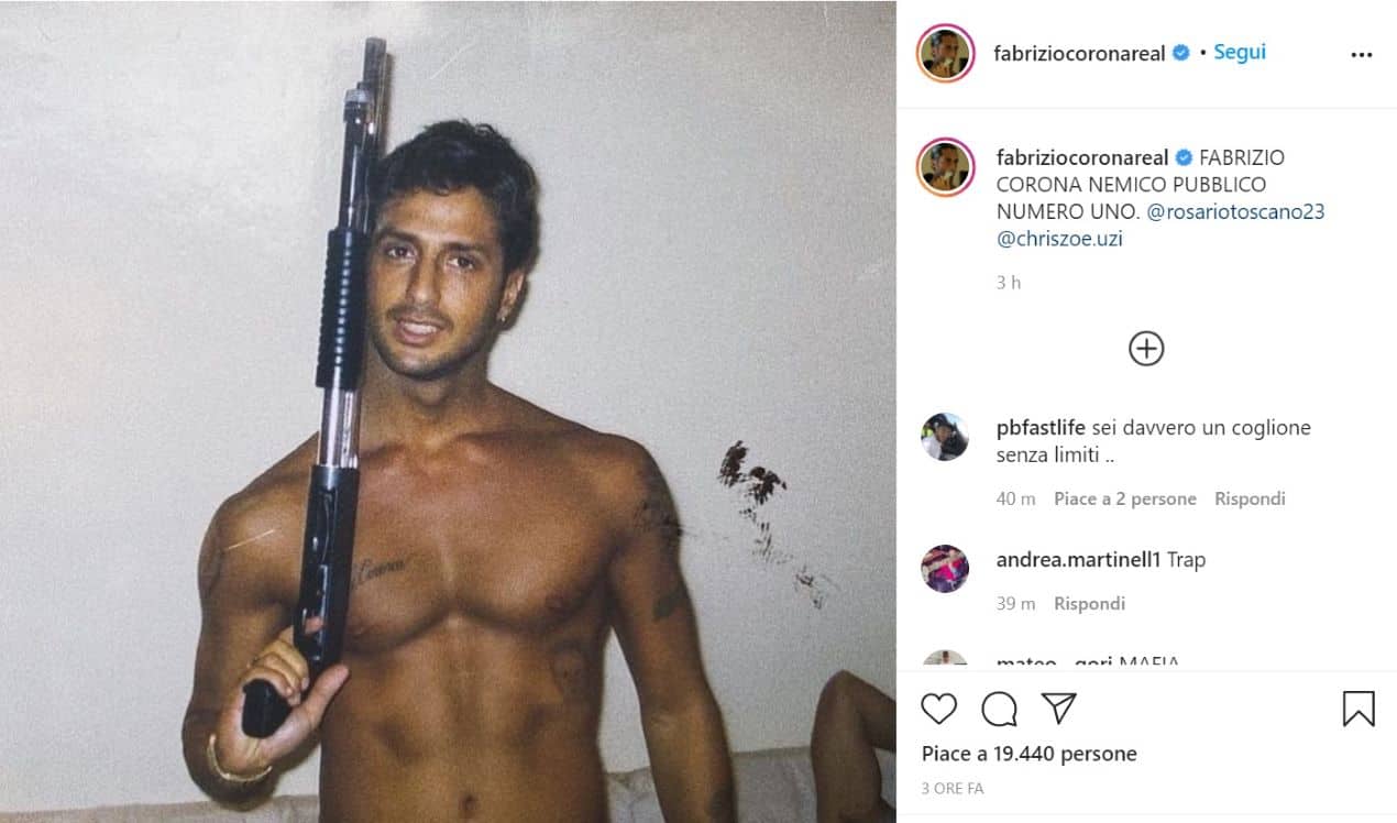 Intanto come sempre il pubblico virtuale di Fabrizio Corona si divide. “Qua.nta roba😍” commenta un utente in calce al post in questione. Un altro puntualizza: “Il nemico numero son i politici”. Mentre che chi usa un linguaggio colorito nel prendere le distanze: “Tu veramente sei scemo”. E ancora: “Comprato da Io bimbo?”. Oppure: “1, Corona è un cazzone e non mi piace, 2, mi pare una foto di molti anni fa sporca pure con una ditata con parte di impronta digitale, 3 è tanto diverso da quelli che hanno una stessa arma o peggio in casa ma non pubblicano una foto di 20 anni fa? Nel senso che mi pare ci siano tanti moralisti che magari poi in casa hanno un arsenale, e chissà quanti, sì non fanno la cazzata di pubblicare una foto del genere (e di scattarsela pure, aggiungo), ma vorrei vedere chi giudica, quanto magari è più esperto di armi di quanto sia questo corona. A me preoccupano anche gli esperti e i maniaci di armi, e sono tanti”. A voi la scelta…