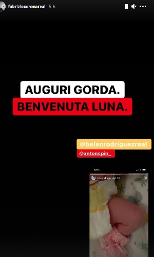 “Auguri gorda, Benvenuta Luna”: così ha scritto Fabrizio Corona ri-postando la foto della piccola e taggando i due emozionatissimi neogenitori, Belen e Antonino. Va da sé che l’affettuoso gesto non è passato inosservato sui social.