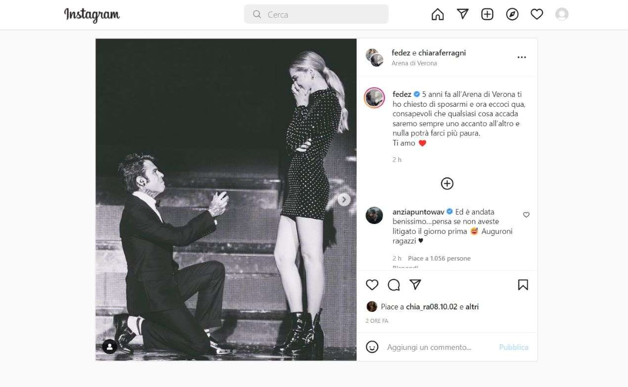 “5 anni fa all’Arena di Verona ti ho chiesto di sposarmi – scrive Fedez in un post sul suo seguitissimo profilo Instagram – e ora eccoci qua, consapevoli che qualsiasi cosa accada saremo sempre uno accanto all’altro e nulla potrà farci più paura. Ti amo ❤️”.