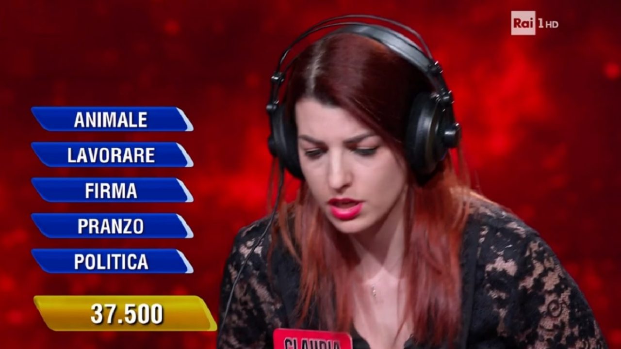 Insinna le ha dato gli indizi, che erano: animale, lavorare, firma, pranzo, politica. Claudia ha esaminato gli indizi ed ha pensato fino all’ultimo alla risposta. Sebbene non fosse ancora convinta della risposta, spinta dalle tempistiche del gioco ne ha scritta una sul cartoncino, ma poco dopo aver finito di scrivere ha capito che aveva dato la soluzione sbagliata e si è rammaricata platealmente.