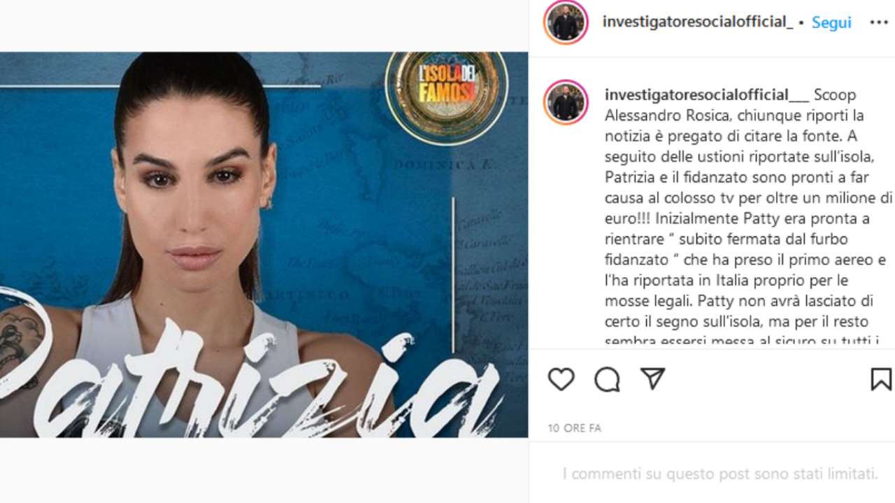 Rosica sostiene che Patrizia era pronta a tornare in gioco e che il fidanzato l’abbia convinta a lasciare l’Isola per poter fare causa alla trasmissione: “A seguito delle ustioni riportate sull’isola, Patrizia e il fidanzato sono pronti a far causa al colosso tv per oltre un milione di euro!!! Inizialmente Patty era pronta a rientrare ‘subito fermata dal furbo fidanzato’ che ha preso il primo aereo e l’ha riportata in Italia proprio per le mosse legali”.