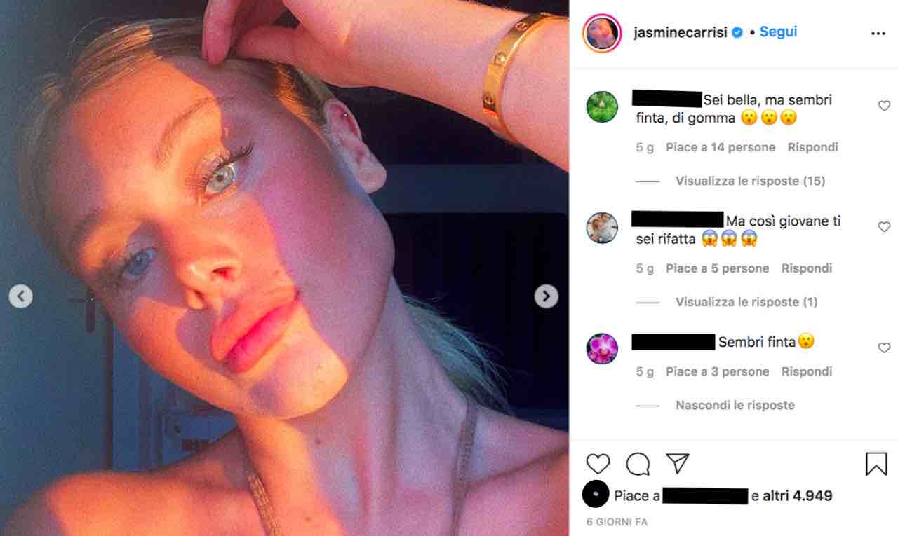“Che ti sei rifatta?”: il commento si può leggere sotto la maggior parte delle fotografie pubblicate dalla figlia di Al Bano. A chiederlo sono sempre persone diverse, non sempre gentili (come chi, sotto un selfie, le scrive “Sembri finta” o “Che paura!”). Se inizialmente Jasmine Carrisi ha provato a scacciare gli haters con l’ironia, però, recentemente ha scelto di essere sincera: non ha nulla di cui vergognarsi per le sue scelte.