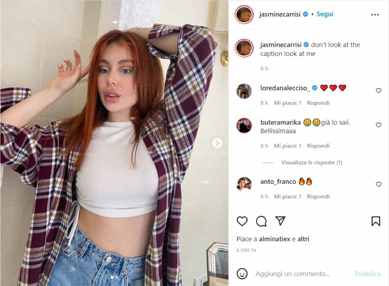 “Don’t look at the caption look at me”, si legge nell’ultimo post su Instagram di Jasmine Carrisi. Vale a dire: “Non guardate la didascalia, guardate me”. Ed è subito pioggia di like, condivisioni e commenti. “Troppo bella”, scrive uno dei tanti utenti del social network.