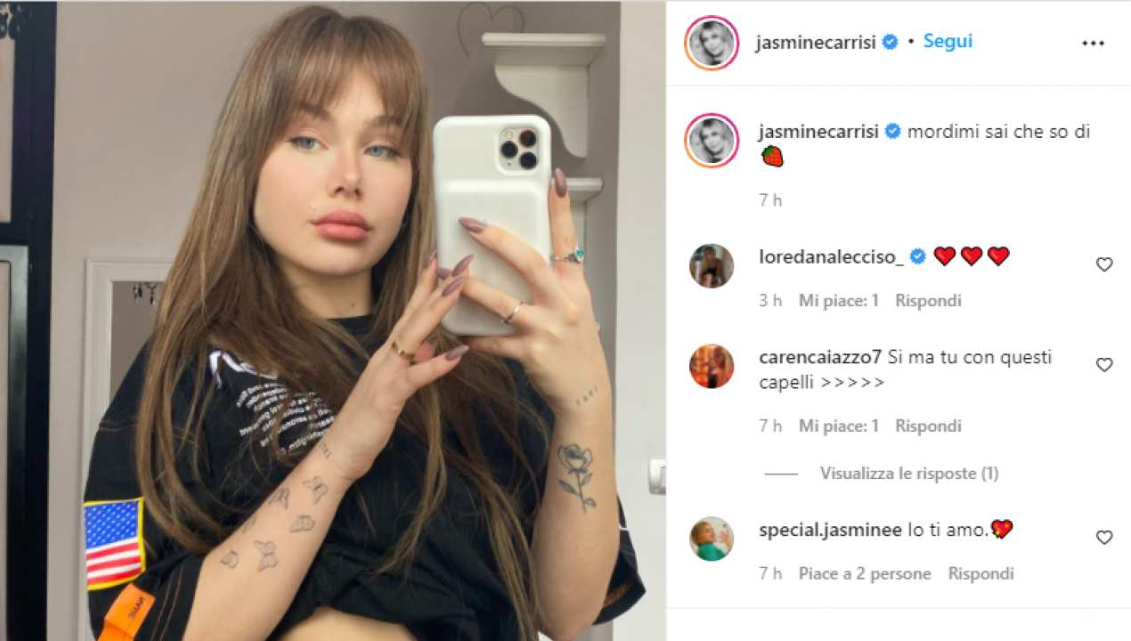 Jasmine Carrisi, la figlia del Leone di Cellino San Marco e della bella Loredana Lecciso, ha oramai vent’anni. Nata nel 2001, sebbene la giovane conduca già da qualche tempo una vita da vera vip, rimane comunque una ragazza che ha appena finito il periodo adolescenziale. Cresciuta coi social media, come Facebook e Instagram, praticamente quotidiana condivide post sul proprio profilo personale. Spessi si tratta di foto che la ritraggono in pose sensuali. Nel post di oggi, la figlia di Albano ha pubblicato un suo selfie di fronte allo specchio, citando il suo nuovo singolo: Fragola.